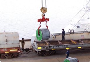 Prikazana je 25 tonska podesiva dizalica namota kako istovaruje namote čelika sa željezničkog vagona.