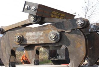 HVATAJUĆA STEZALJKA: Ovaj model 1529 stezaljki za podizanje valjaka u čeličani podiže okrugle čelične kaleme od 12 do 40 inča u promjeru i mase do 22 tone. |